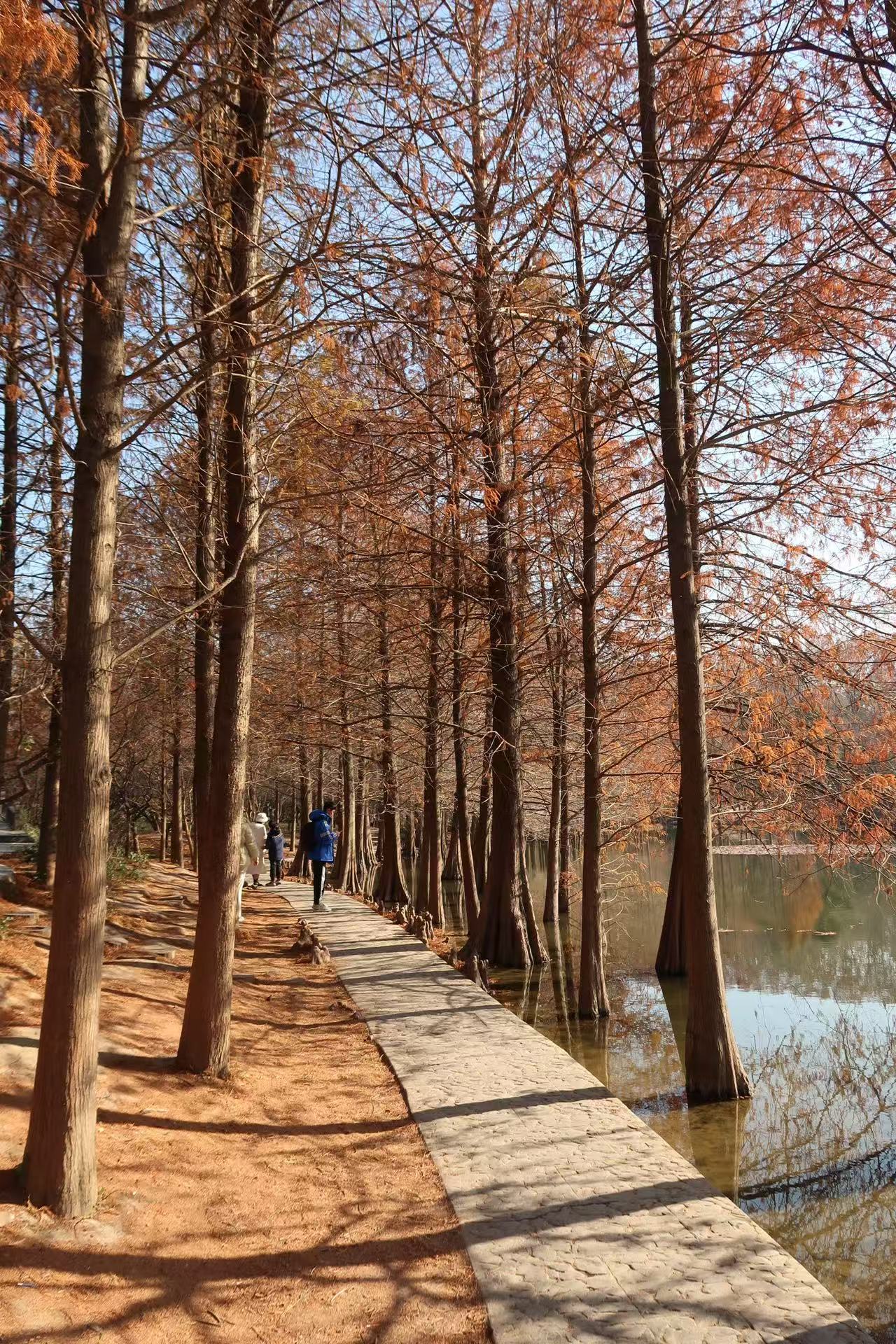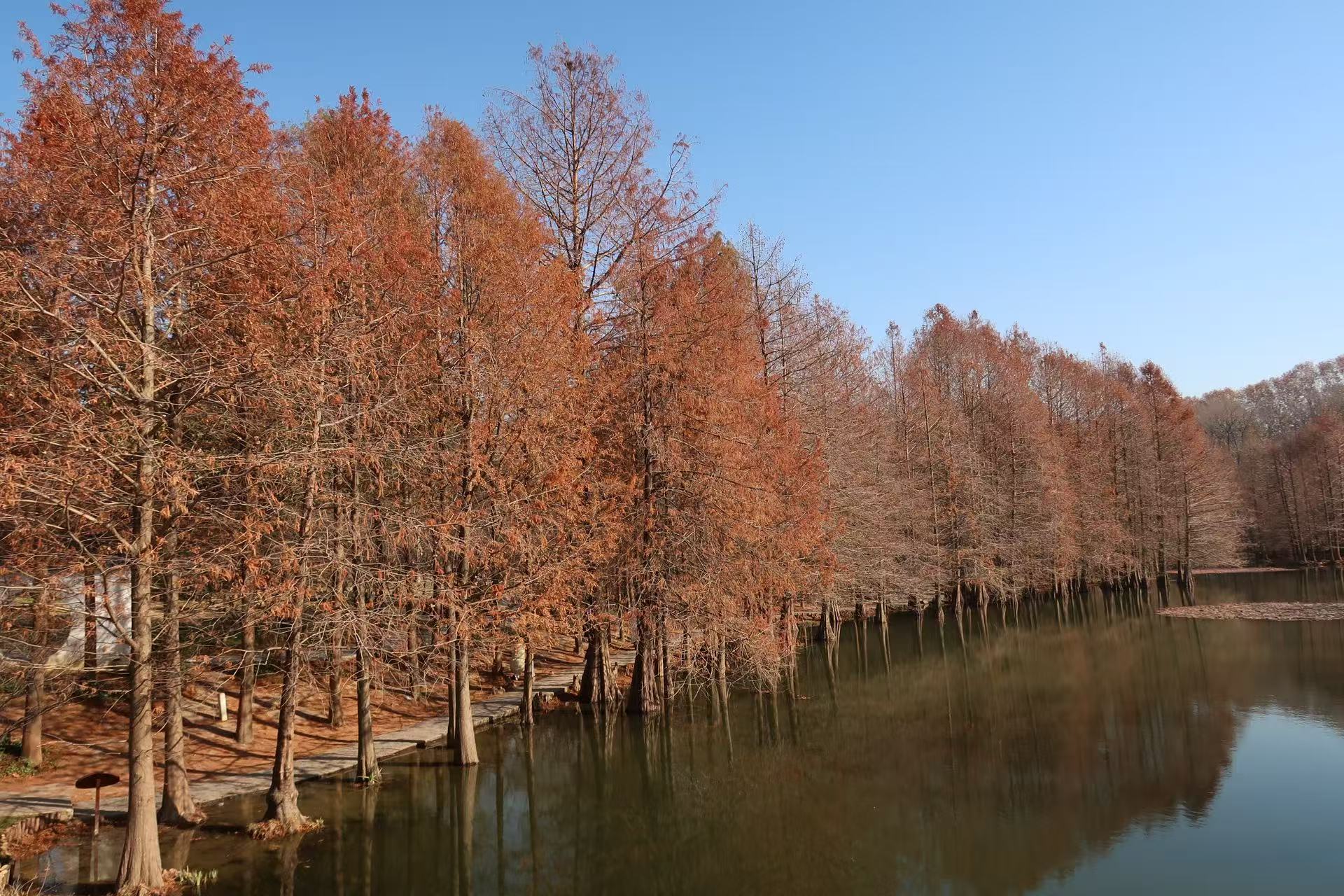 The bald cypress trees by Yanque Lake in the Imperial Tombs of the Ming and Qing Dynasties create a stunning scene during autumn and winter.