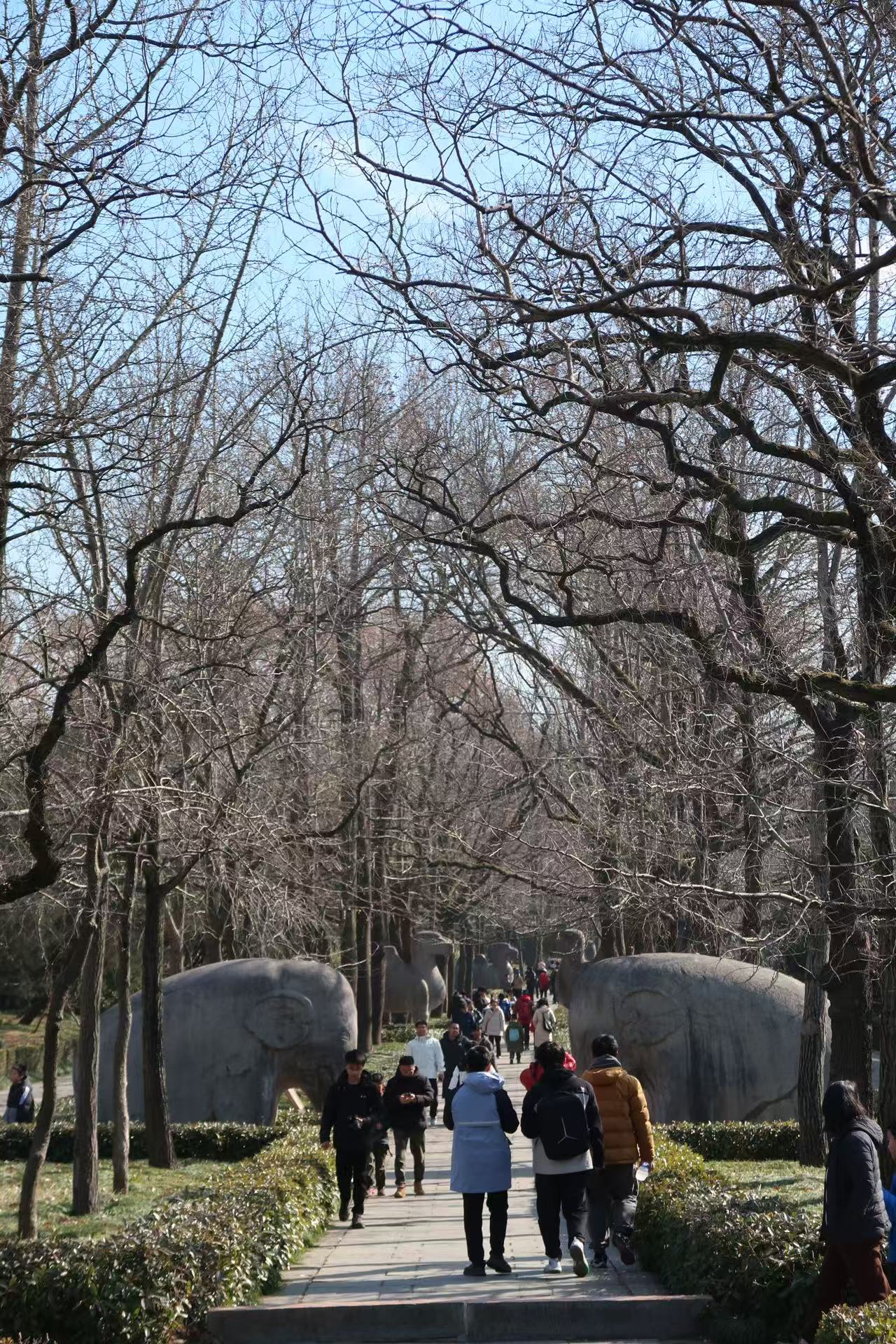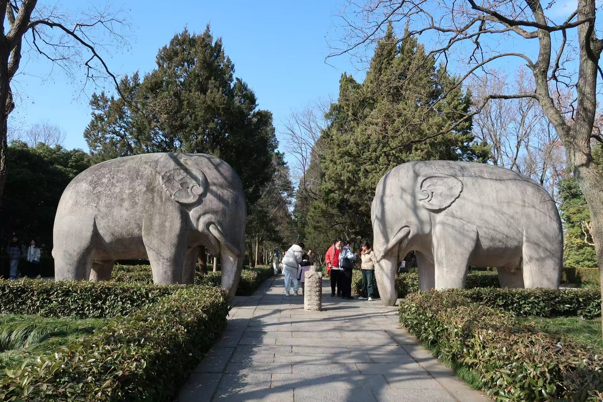 The stone statue avenue is part of the Sacred Way leading to the tomb, lined with an array of lifelike stone sculptures, including lions, elephants, mythical beasts like qilin, and statues of civil and military officials.