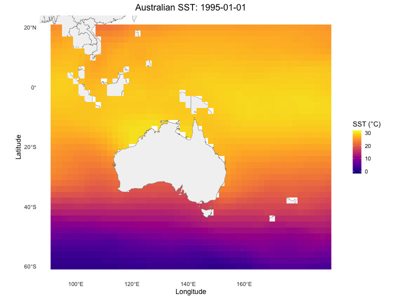 Figure 1: Animation to visualize monthly changes to Sea Surface Temperature, January 1995 to December 2025