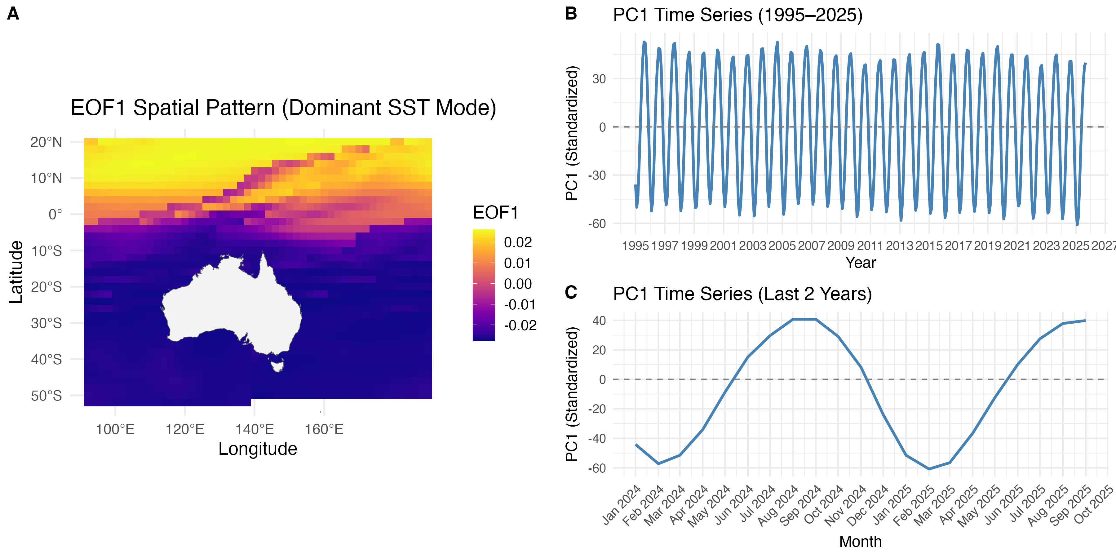 Left (A): Spatial pattern of the first Empirical Orthogonal Function (EOF1), showing cooler SSTs around southern Australia and warmer SSTs to the north. Right (B–C) Time series of the first Principal Component (PC1): (B) 1995–2025 and (C) the past two years, highlighting strong seasonal cycles with peaks in winter and troughs in summer.